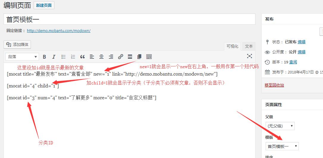 新建页面,选择【首页模板一】模板,内容框里输入短代码